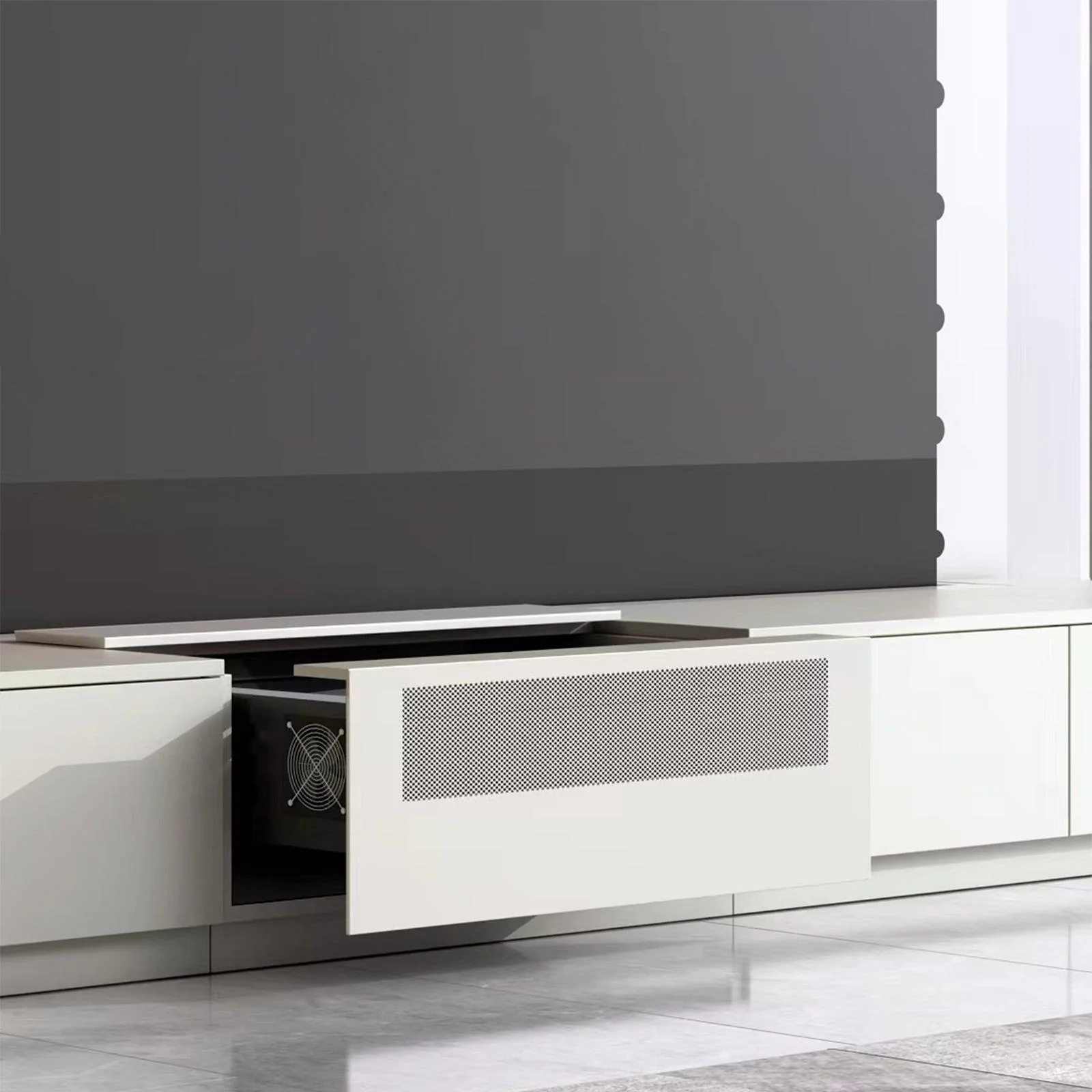 • Công năng: Hàng ngàn lỗ nhỏ li ti hoạt động như một lớp lưới tản âm, cho phép sóng âm từ loa soundbar đặt bên trong tủ đi xuyên qua gần như không bị suy hao. Bạn có thể trang bị những hệ thống loa thanh mạnh mẽ nhất, giấu chúng hoàn toàn khỏi tầm mắt mà vẫn tận hưởng được chất âm nguyên bản, chi tiết và đầy uy lực.