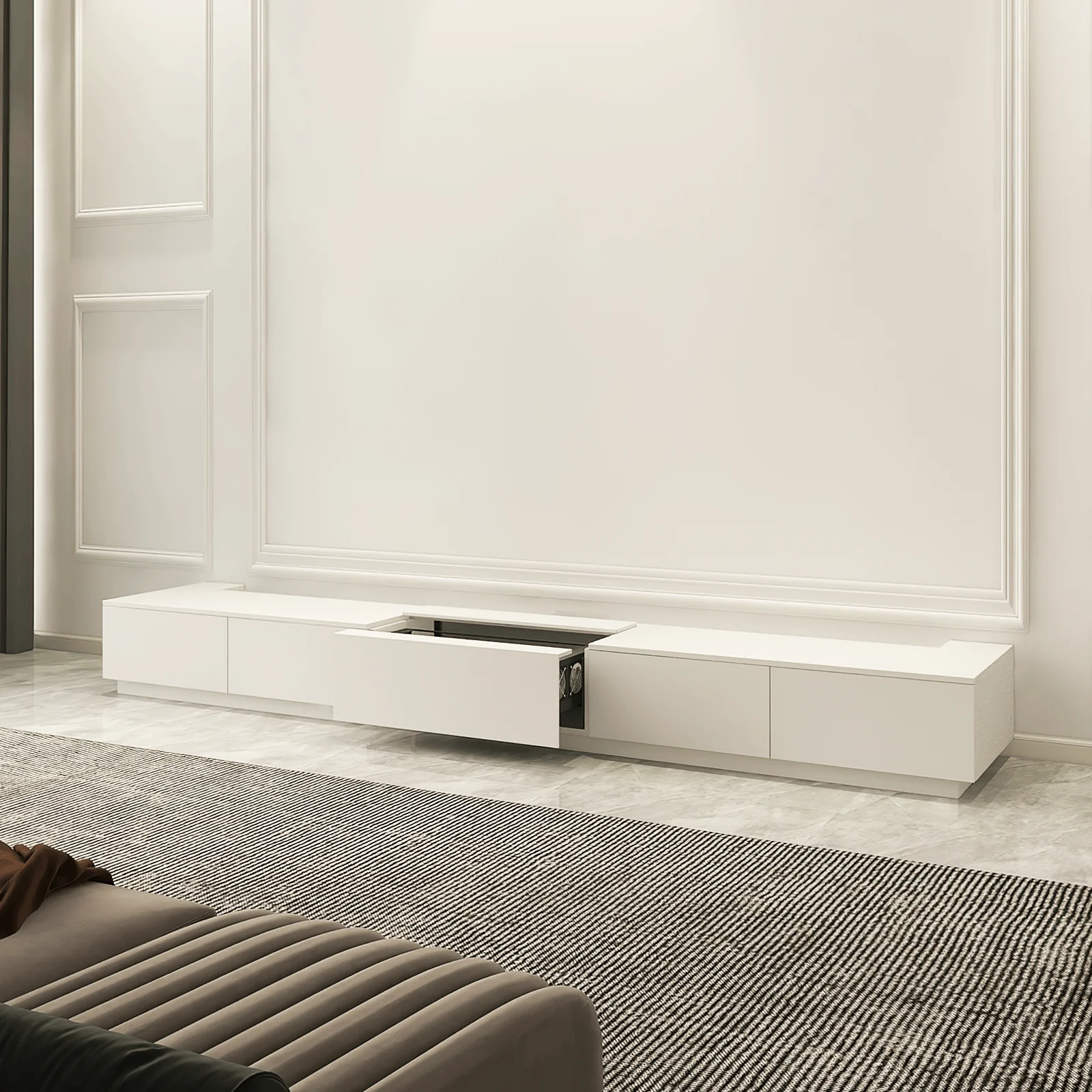 • Thẩm mỹ: Giải pháp này giúp duy trì sự tối giản tuyệt đối cho không gian giải trí. Không còn cảnh loa hay dây nhợ lộ ra ngoài, tất cả những gì bạn thấy là một chiếc tủ nội thất liền lạc và sang trọng. Hiệu suất âm thanh mạnh mẽ giờ đây trở nên vô hình.