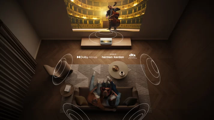 Một rạp phim gia đình sẽ không hoàn thiện nếu thiếu âm thanh uy lực. Xgimi Aura 2 sở hữu hệ thống loa Harman Kardon công suất lên đến 60W tích hợp bên trong.